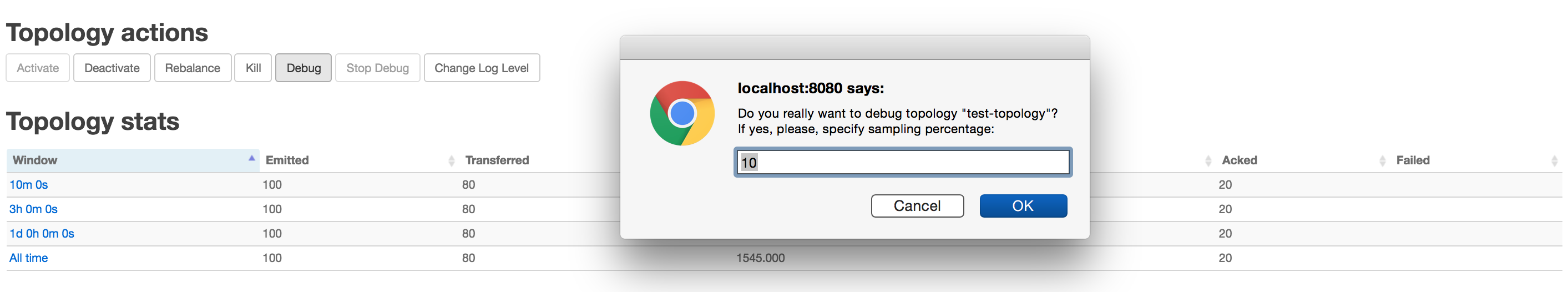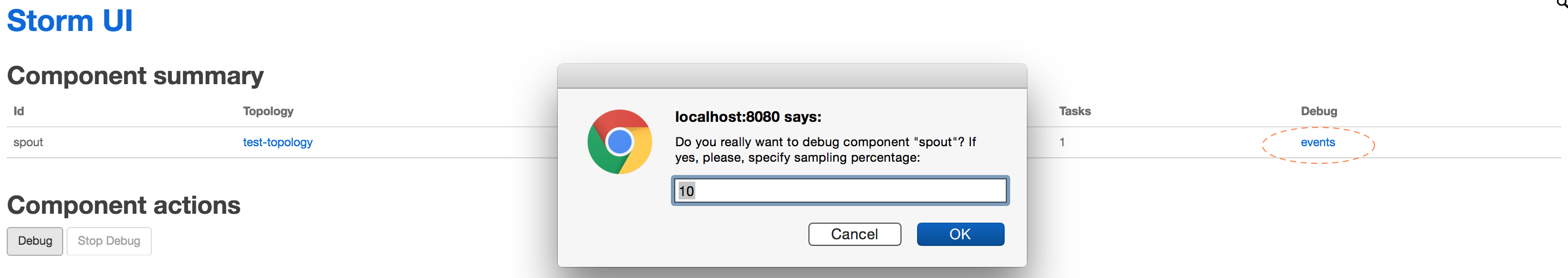 可以通过在拓扑视图中的拓扑操作下单击“调试”按钮来记录事件。这会记录来自所有spouts(喷口)和bolts(螺栓)的元组以指定的采样百分比在拓扑中。